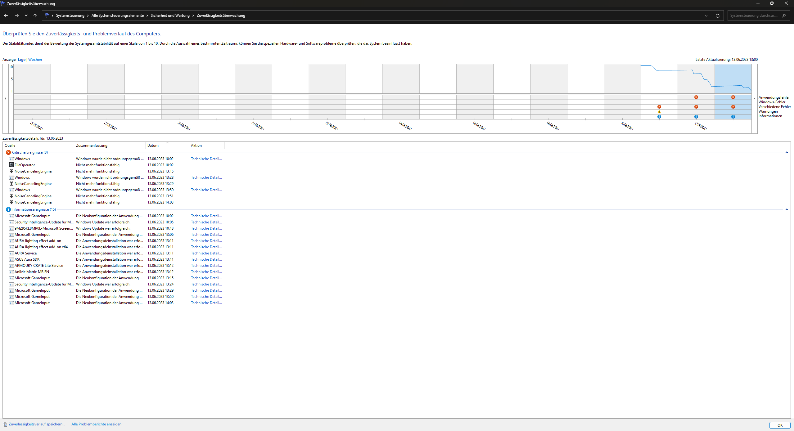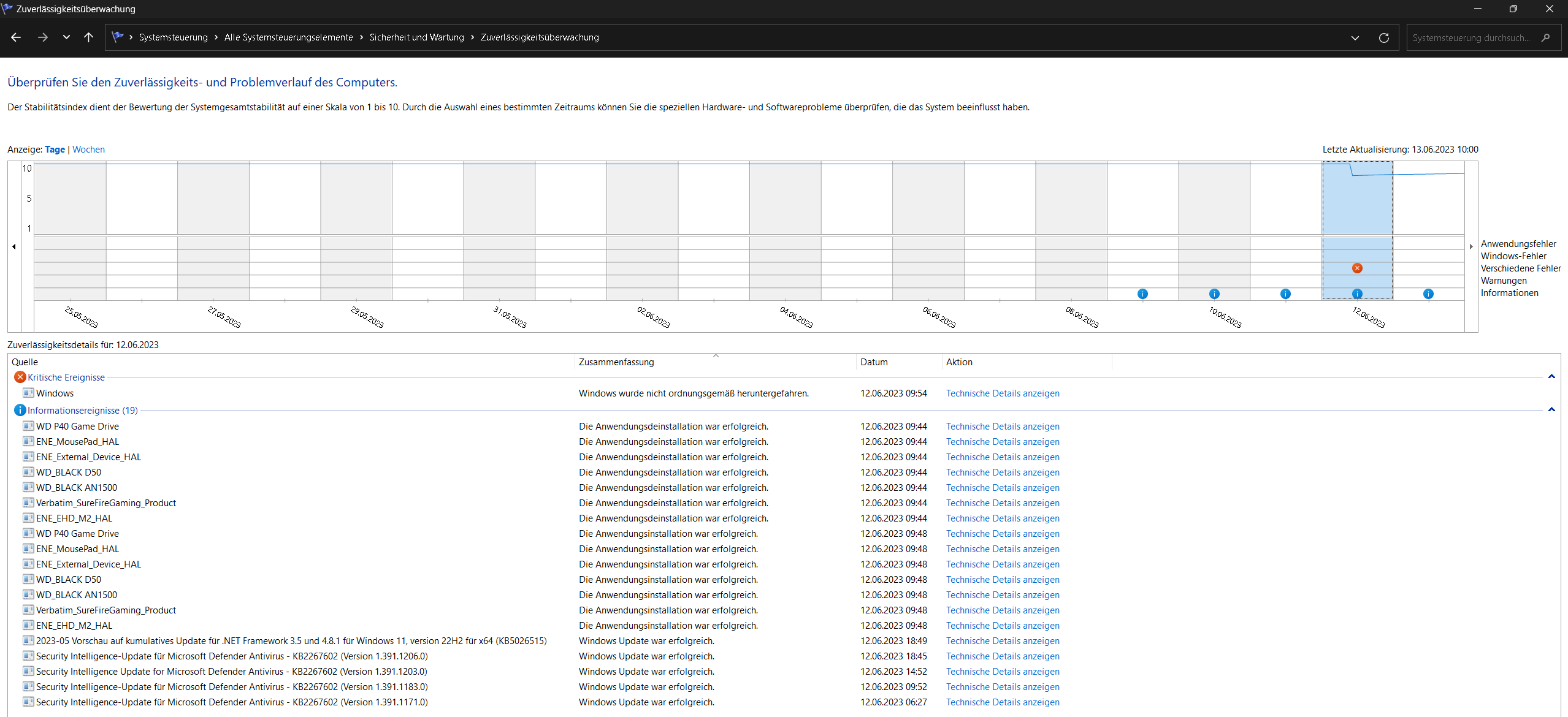 Schau mal bitte in den Zuverlässigkeitsverlauf ob dort Fehler drin stehen.Sollte so aussehen, der Windows Fehler kam bei mit durch eine kleine Panne, Hatte aus versehen die falsche Funksteckdose abgeschaltet.