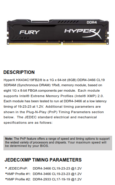 Das stimmt so nicht ganz! Kingston HyperX Fury ist bis DDR4-3466 mit 1,2v und JEDEC spezifiziert und würde auf einem entsprechenden System mit dieser Geschwindigkeit ohne weiteres zutun laufen. Allerdings reicht die höchste CPU Spezifikation derzeit bis DDR4-2933 auf AMD Systemen und es ist nicht zu erwarten, dass die nochmal relevant erhöht wird, bevor DDR5 das Licht der Welt erblickt.