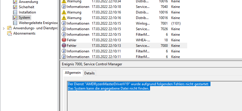Fehler laut ereignismanager: Der dienst "amdryzenmasterdriverv19" wurde aufgrund folgenden fehlers nicht gestartet: das system kann die angegebene datei nicht finden.