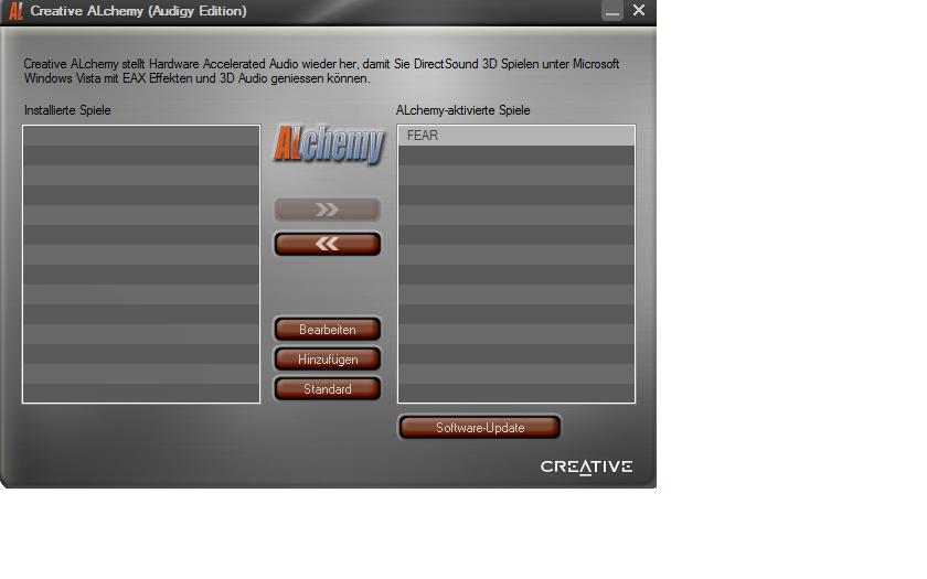 ich habe seit kurzen den kostenpflichtigen Treiber für meine Audigy 2 runtergeladen um wieder EAX mit meiner Soundkarte unter Vista 64 Bit nutzen zu können! Als Testspiel habe ich einfach mal die F.E.A.R. Perseus Mandate Demo runtergeladen und es versucht ob es funktioniert! Leider war das nicht der Fall! Ich habe im Spiel wenn ich es aktiviere gar keinen Sound, wenn ich ALchemy deaktiviere ist alles bestens, nur halt ohne EAX HD usw. Ich hab mal paar Screenshots im Anhang,vielleicht könnt ihr mir helfen was ich falsch gemacht habe und es erkennen! Vielen Dank schonmal im Vorraus!