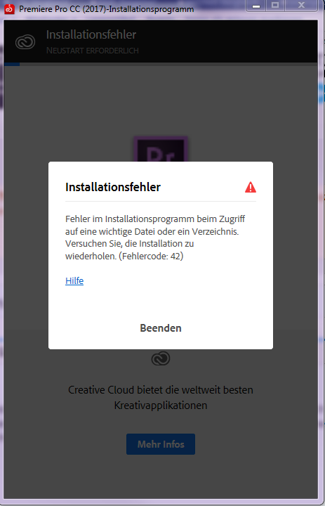 Da ich zurzeit die CreativeCloud intensiv verwende wegen ein paar Videoschnitten zu Trailern etc. nun habe ich jedoch Windows 7 neu installiert (ich weißt windows 10 wäre besser aber es gibt ein paar Programme die ich brauche und nur noch dort gehen). Nun habe ich jedoch ein Problem: und zwar will ich Premiere Pro 2017 installieren und bekomme immer diesen Fehler: