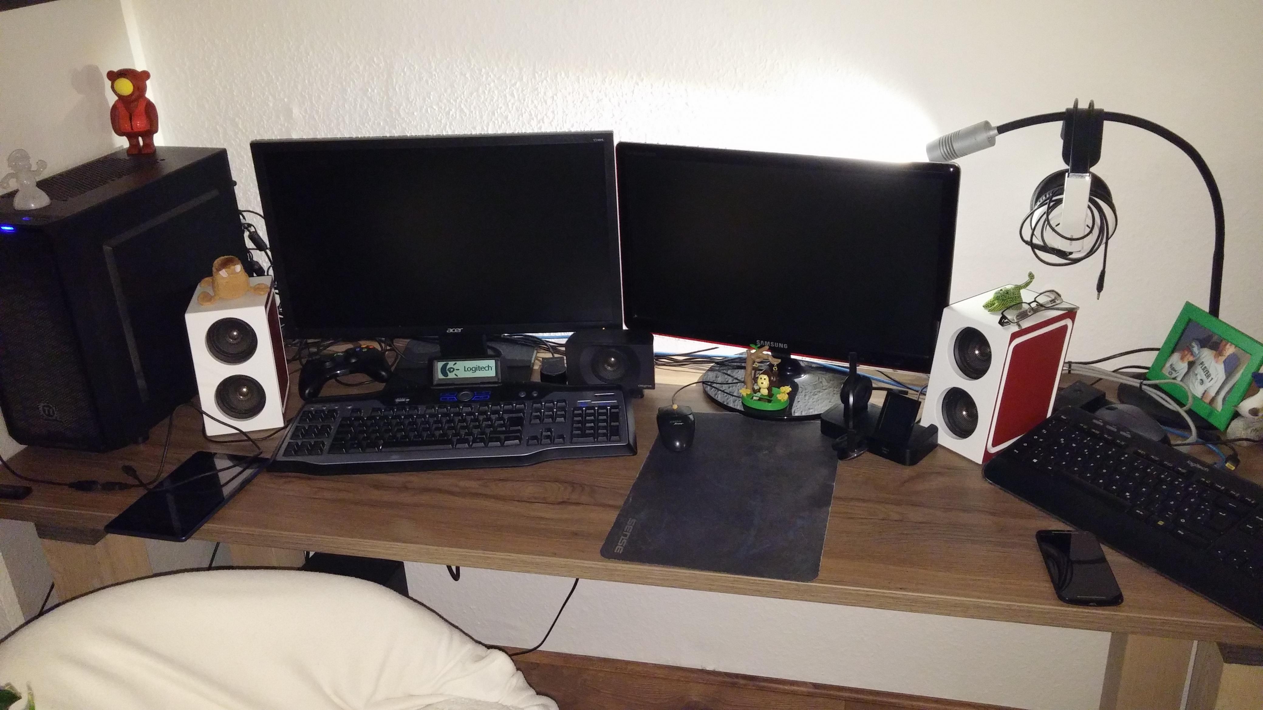 a) Gibt es eine externe Soundkarte oder eine Art Regler die ich zwischen PC und Boxensystem klemmen kann, sodass ich quasi den einen Sweetspot am Lautsprecher eigenen Drehregler festlege, ihn auf Seite tu und stattdesen die Alternative auf dem Schreibtisch habe, woran ich die Lautstärke regel und idealerweise auch ein Headset anschließen kann?