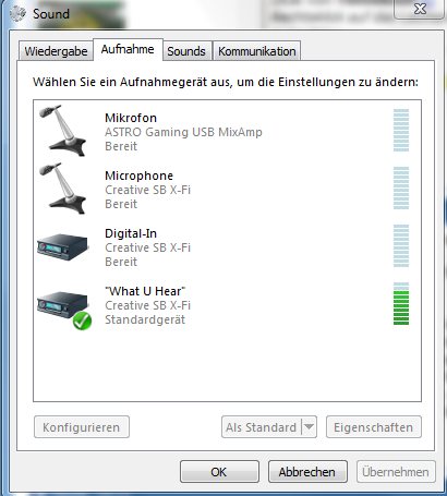 Der Sound scheint nur über ein aktiviertes "What you hear" zu funktionieren. Sobald ich dieses "What you hear" im Aufnahmereiter abstelle, ist der Sound komplett weg. Leider habe ich nicht mehr im Kopf, wie man "What you hear" abstellt und trotzdem Sound hat.