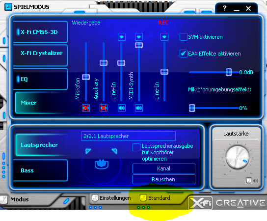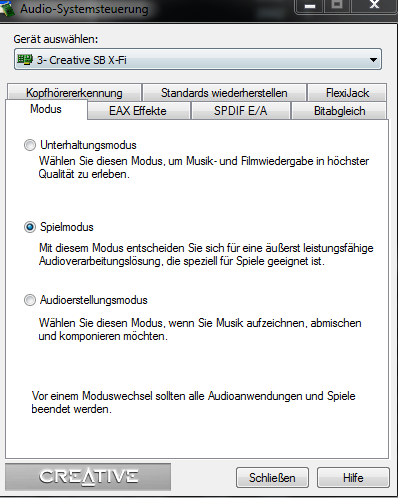 Doch ich fand eine andere Ursache, die mir vorher noch nicht aufgefallen war: in der Creativ Audio-Systemsteuerung kann man zwischen 3 Modi wählen: Unterhaltungsmodus, Spielmodus und Audioerstellungsmodus. Ich hatte die Karte seit jeher im Spielmodus laufen. Sobald ich aber jetzt auf Unterhaltungsmodus umschaltete, war auch wieder Ton zu hören!