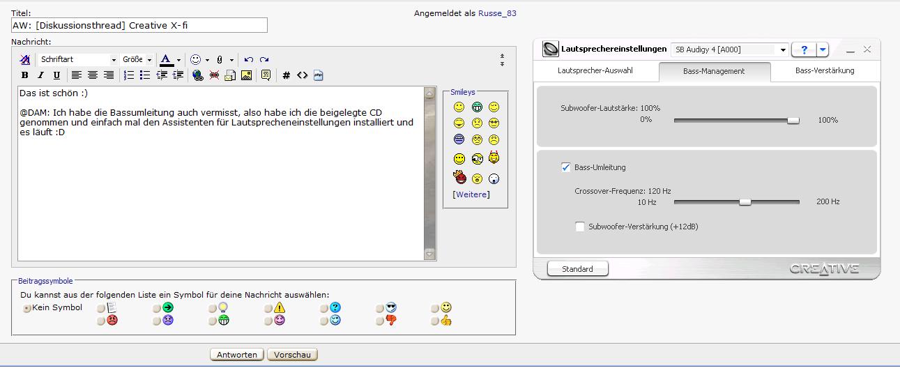 @DAM: Ich habe die Bassumleitung auch vermisst, also habe ich die beigelegte CD genommen und einfach mal den Assistenten für Lautsprecheneinstellungen installiert und es läuft