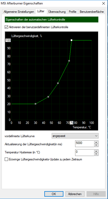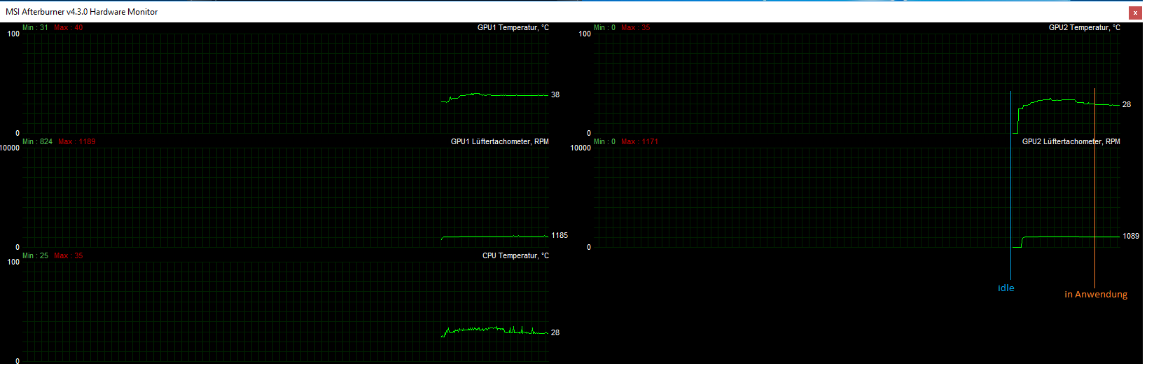 Msi: Habe die Lüfterkurven für die 2 Karten festgelegt und auf manuell gestellt, erste karte befolgte den Anweisungen und jetzt das komische , die zweite Karte nur in Anwendungen, also zum Beispiel in Spielen. Sobald ich aus den Spielen ausstieg ging die temp, taktrate und co sofort auf 0 als ob afterburner sie nicht erkennen würde