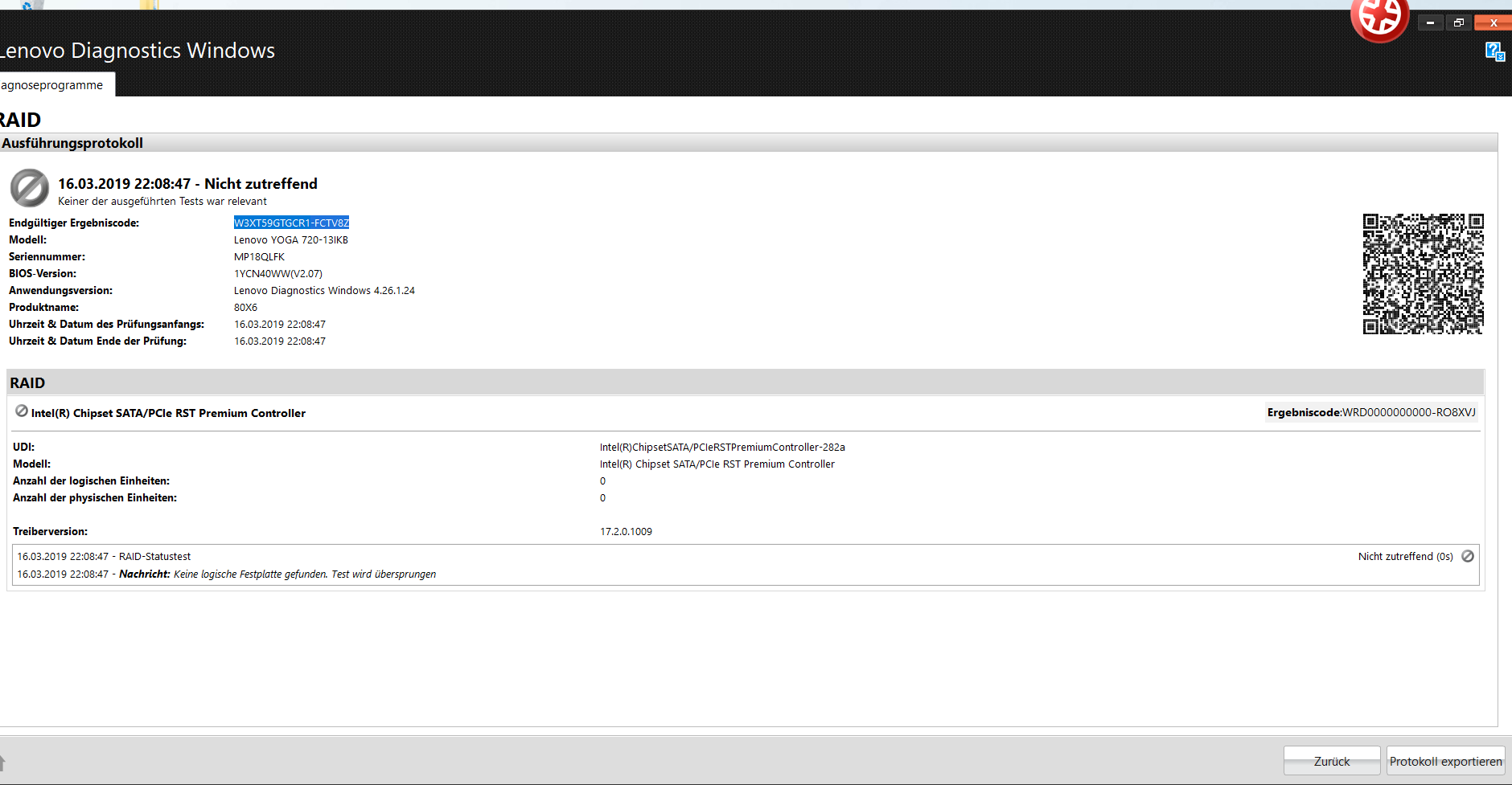 Gemacht! Ich habe Prozessor, Arbeitsspeicher, Steuerplatine, PCI Express und Speicher überprüft - alles okay. Bei RAID wird allerdings wieder nichts erkannt. Siehe Screenshot 1 im Anhang.