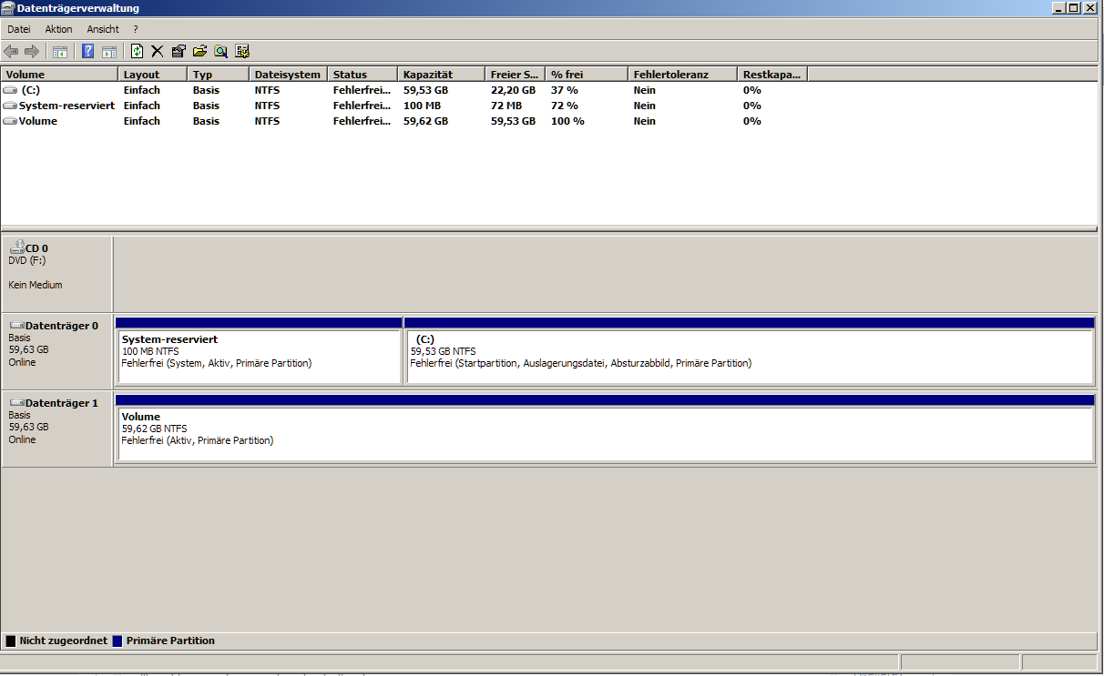 Beide SSD haben eine Partition die Aktiv ist, bei Datenträger 0 ist es die 100MB Partition und bei Datenträger 1 eine Partition über die ganze Platte. Auf einer von denen steht der Bootloader von Win 8, vermutlich auf Datenträger 1 und wenn Du die ausbaust oder gründlich platt machst, wobei die Datenträgerverwaltung Dir das nicht erlauben wird wenn der Bootmanager der ist der aktuell genutzt wird, kannst Du dann nicht mehr booten. Klemme mal den Datenträger 1 ab und schau ob Du noch booten kannst, ich fürchte nicht mehr, weil die Partition wohl vom Windows Installer angeelgt wurden. Damit das nicht passiert, klemme man eigentlich immer alle anderen Platten vor einer Windows Installation ab!