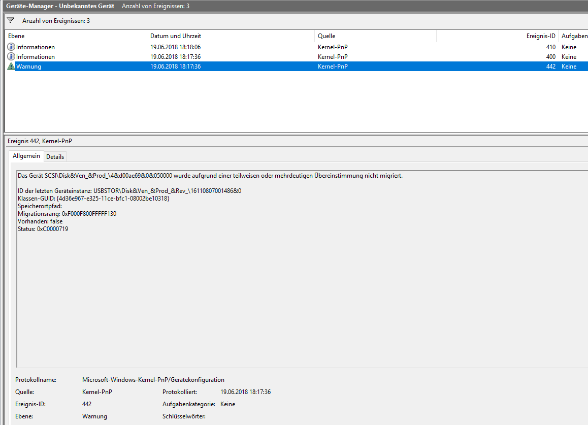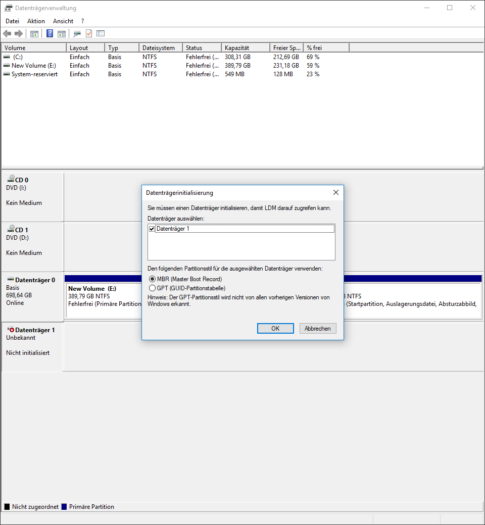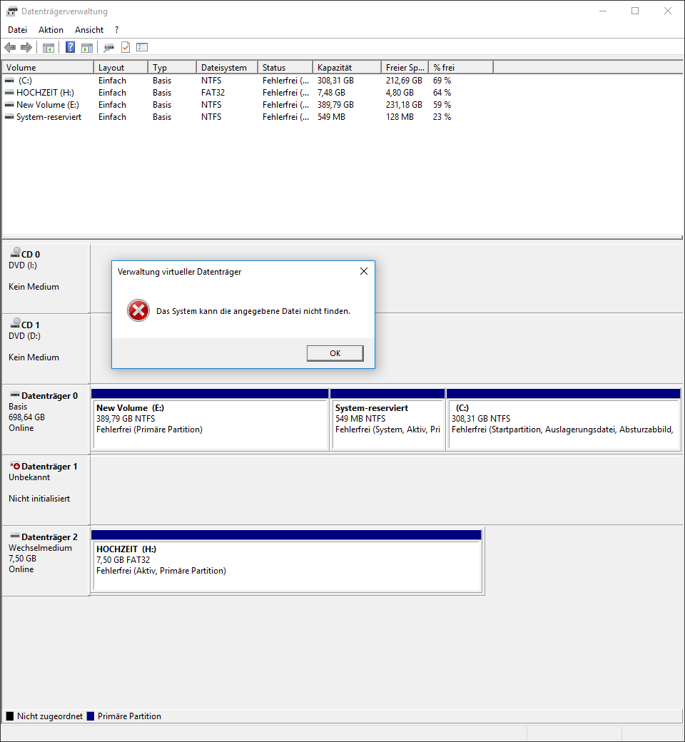 Aber, in der Festplattenverwaltung kann ich sie sehen. Ich kann Sie nur nicht initialisieren, es wird sofort abgebrochen und gemeldet, dass die angegebene Datei nicht gefunden werden konnte.