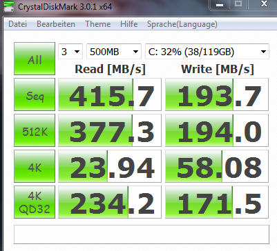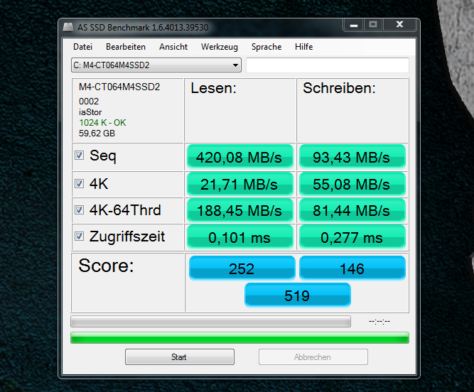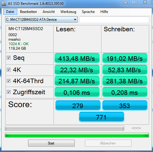 Nein, denn Du hast da einen Writecache mitgebencht, das sieht man schon beim seq. Schreiben und erst recht bei 4k_64. So schnell ist die m4 alleien gewöhnlich nicht und keine SATA SSD schafft bei 4k_64 bessere Werte als seq.