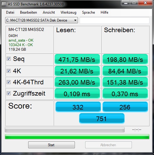 Meine 128GB M4 macht laut Atto bei 4K 119MB/S write und 135MB/s lesen mit Firmware 0309