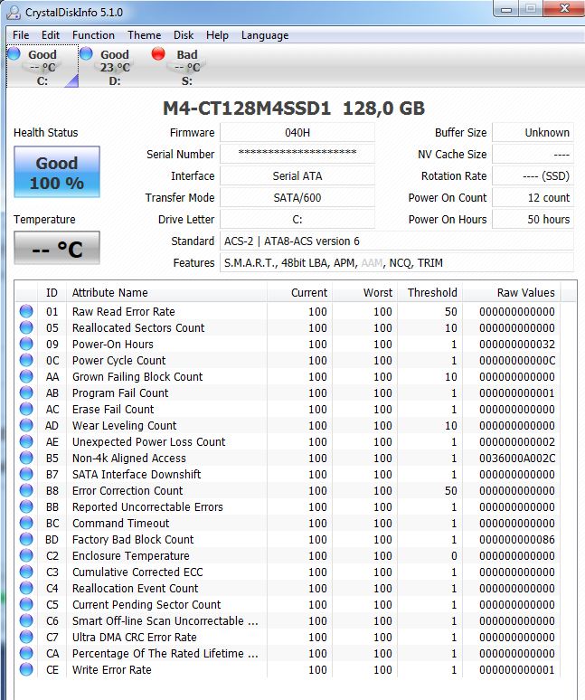 Die hat ein paar defekte NAND Blöcke die ersetzt wurden. Dieser Raw Read Error Reads sehen schlimm aus, daber das scheint weniger dramatisch zu sein, denn die m4 im Dauerschreibtest auf xtremesystems.org hat die auch schon lange und auch da steht der aktuelle Wert auf 01, sie läuft aber trotzdem.ByteFax schrieb:Die SSD2 wird mir schon als "fast tot" angezeigt im SMART