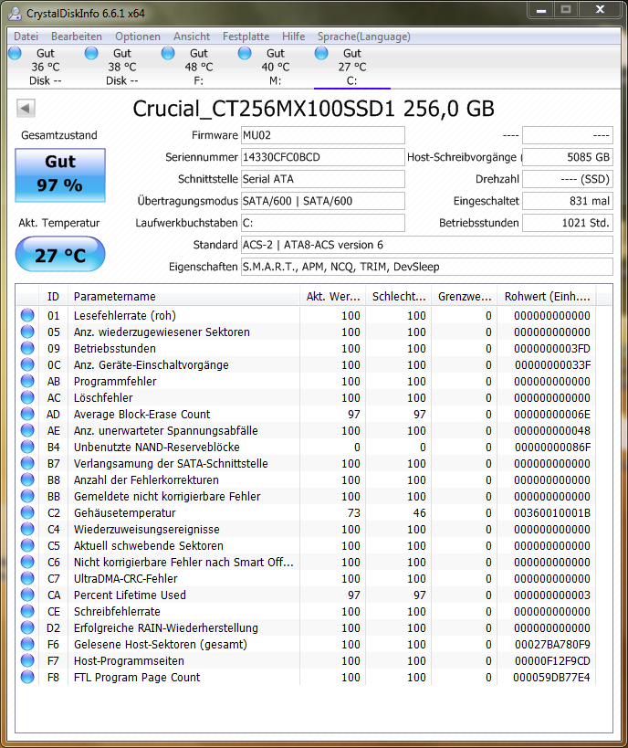 ich habe mir einen neuen PC zusammengestellt und die Crucial Mx100 256GB + eine 1tb Seagate baracuda im AHCI modus in meinem Pc verbaut und Windows auf der SSD installiert. Doch nach einer Woche Stürzt der Pc manchmal ab und nach dem Neustart erkennt er die Festplatte nicht. Erst nach dem 2. Versuch wird sie erkannt und der Pc bootet normal mit der Windows Fehlermeldung das der pc nicht richtig runter gefahren wurde blabla. Irgendwelche Lösungsvorschläge?