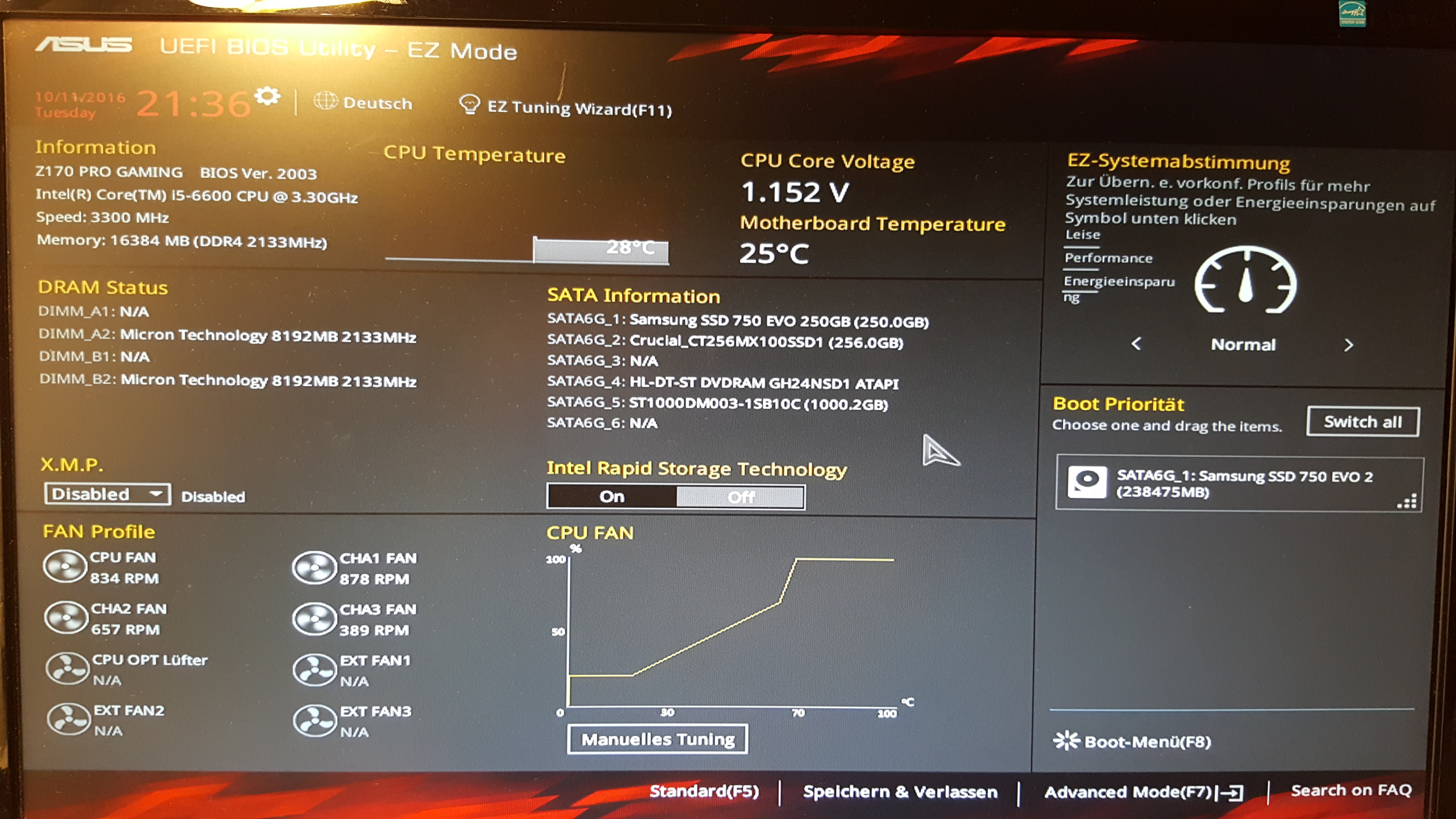 Heute Nachmittag den PC wie gewohnt heruntergefahren, eben angeschaltet und ich war wieder im BIOS. SSD war nicht in der Boot-Liste, sprich nicht erkannt. Habs eben wieder eingestellt.