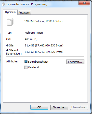 Wenn ich alle Ordner innerhalb meiner Systemfestplatte markiere und auf Eigenschaften gehe sehe ich, dass ich nur 80GB belegt habe.