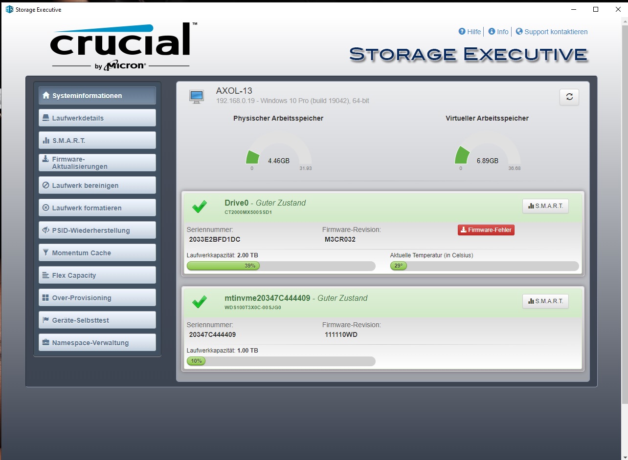 Mit der neuen Version 7.01 von Crucial Storage Executive wurde der "Firmware-Fehler"-Bug endlich behoben. Ich konnte erfolgreich eine MX500 1TB von M3CR032 auf M3CR033 updaten.