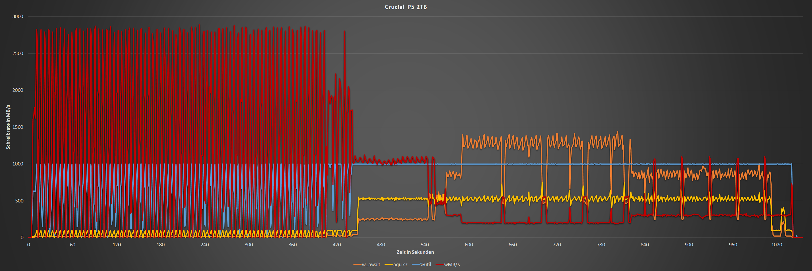 Die Schreibrate bricht zum Teil extrem ein und w_await sprengt die Skala des Diagramms