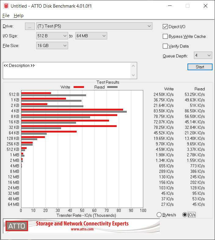 Bei sehr kleinen Daten (<256KB) ist die Schreibrate im Vergleich zur Leserate deutlich geringer. Außerdem sind deutliche und anhaltende Einbrüche beim dauerhaften Schreiben zu beobachten.