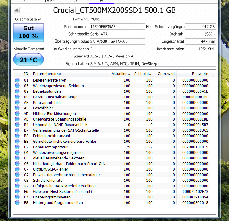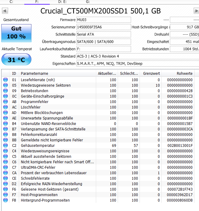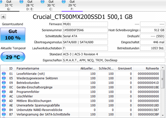 446 unterwartet Spannungsabfälle bei 447 Einschaltungen, entweder wird der Rechner nie ordentlich runtergefahren oder die SSD bekommt das nicht mit, was bei der MU01er FW vorkommen kann. Auch wundert mich, dass sie durchschnitt noch 0 P/E Zyklen runter haben soll, obwohl fast schon doppelt so viel wie die Kapazität geschrieben wurde, 1 müsste da stehen, oder ist das keine 2.5" Version? Dann könnte man es mit dem Pseudo-SLC Cache erklären, aber die 2.5" mit 500GB hat den doch angeblich nicht.