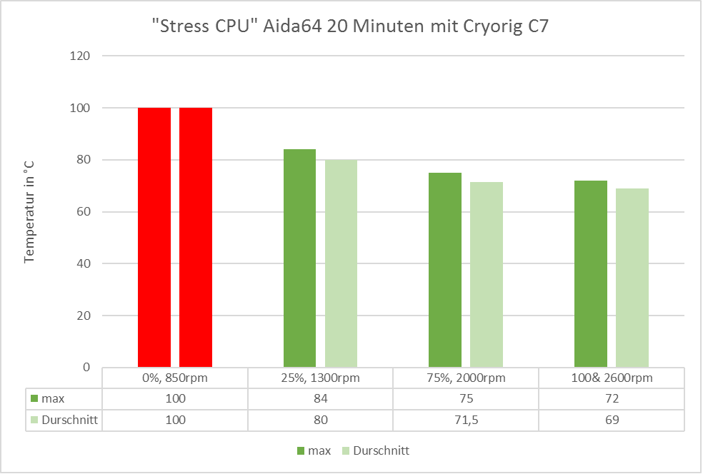 Im „realen“ Szenario beim „Stress CPU“ Test schlägt sich der Kühler wacker. Die package Temperatur liegt im Schnitt bei 70-72°C bei ~2000 U/min also 75% der max Lüfter Drehzahl. Bei der niedrigsten Drehzahl von 850 U/min kriegt der C7 die Wärme allerdings nicht mehr abgeführt und die Temperaturen steigen in Richtung der 100°C Grenze.