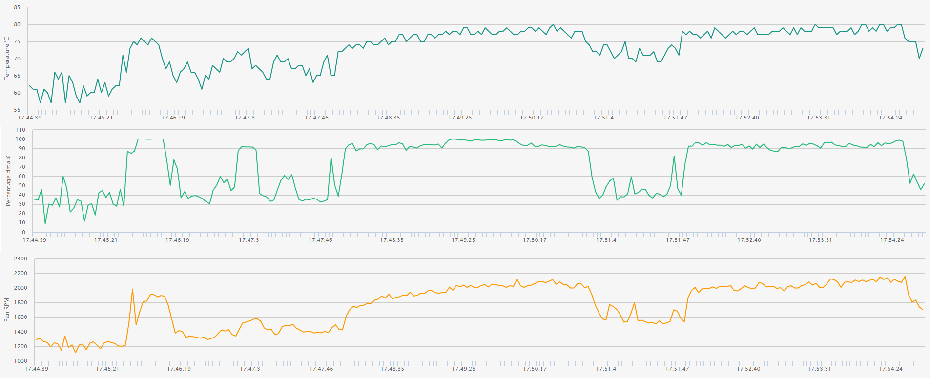 Der kleine Kühler kommt bei dem „Stress FPU“ Test an seine Grenzen. Die Temperaturen der einzelnen Kerne erreichen kurzzeitig 100°C und die CPU taktet kurzzeitig immer wieder mal um 100-200Mhz herunter. Der Lüfter dreht dabei auf 100% mit ~2600 u/min. Da ich die CPU nicht 15 Minuten lang bei Temperaturen um die 100°C quälen möchte, wie der Test abgebrochen.