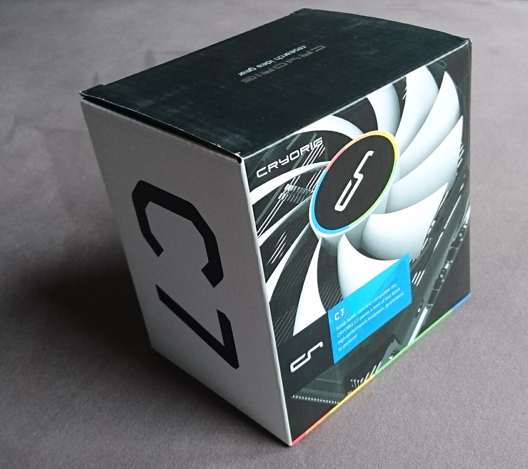 Der Kühler kommt in einem recht kleinen schwarzen Karton. Farbliche Akzente werden durch