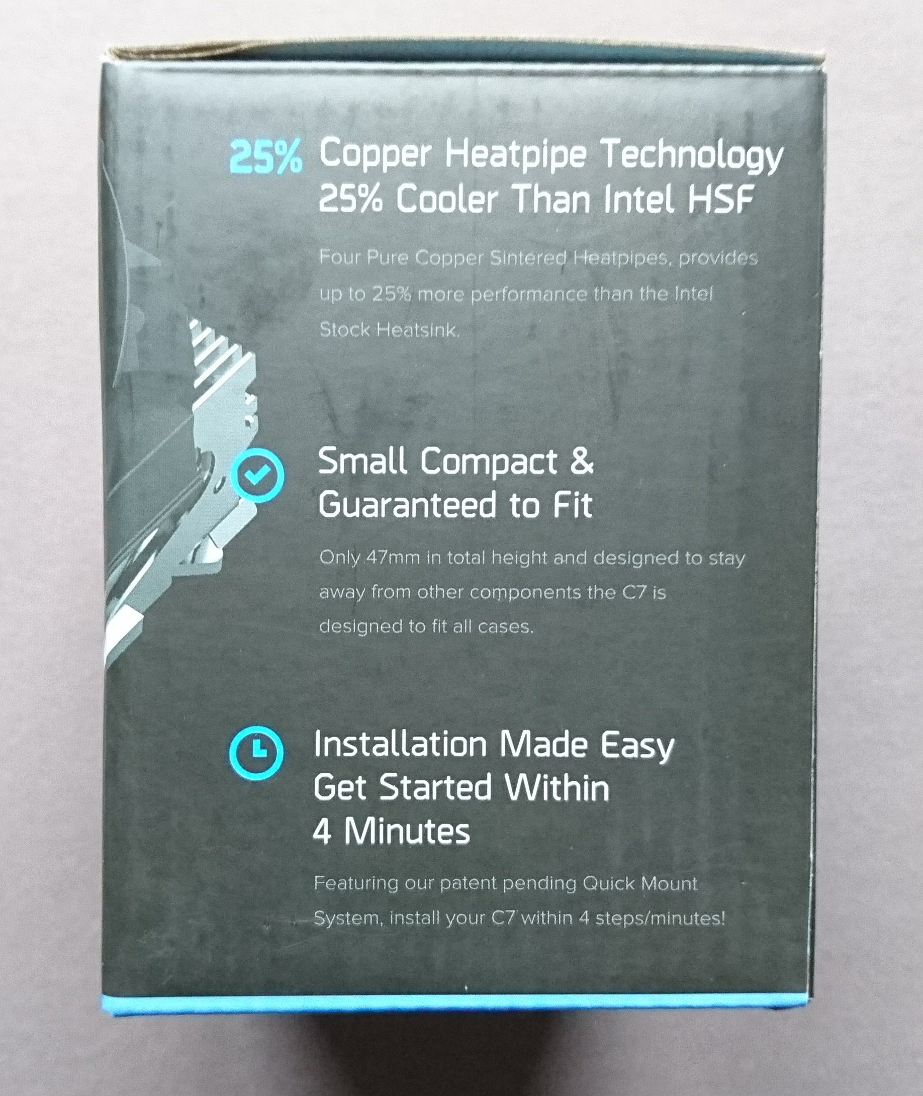 Alle wichtigen Informationen zum Kühler sind auf der Rückseite des Kartons angeben. Laut der Verpackung sei der Kühler 25% effizienter als der Intel Boxed Kühler. Zudem sei er designed um in jedes Gehäuse zu passen und soll innerhalb von 4 Minuten montiert sein.
