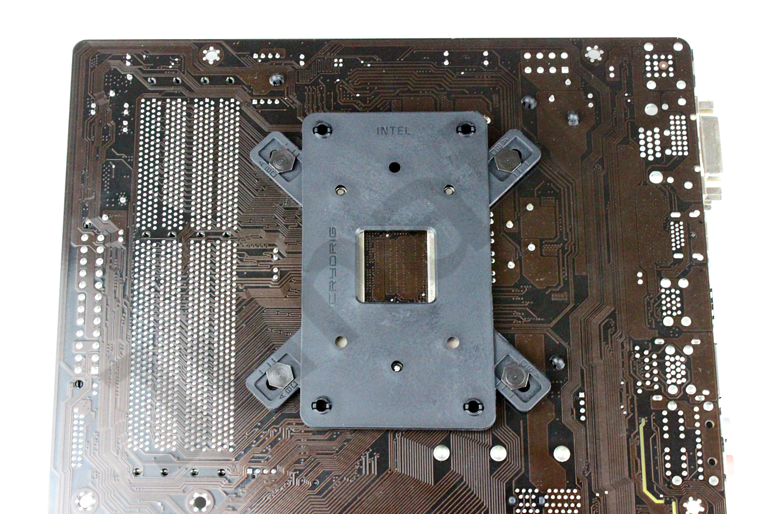 Der Einbau besteht aus drei sehr kurzen Schritten. Der erste besteht darin, die Backplate mit der richtigen Seite und den vier Schrauben, von der Rückseite an das Mainboard zu legen. Durch die kleinen Nasen in der Backplate, bleiben die Schrauben auch ohne Hilfe stecken und müssen nicht von der Mainboard Seite, gesichert werden.