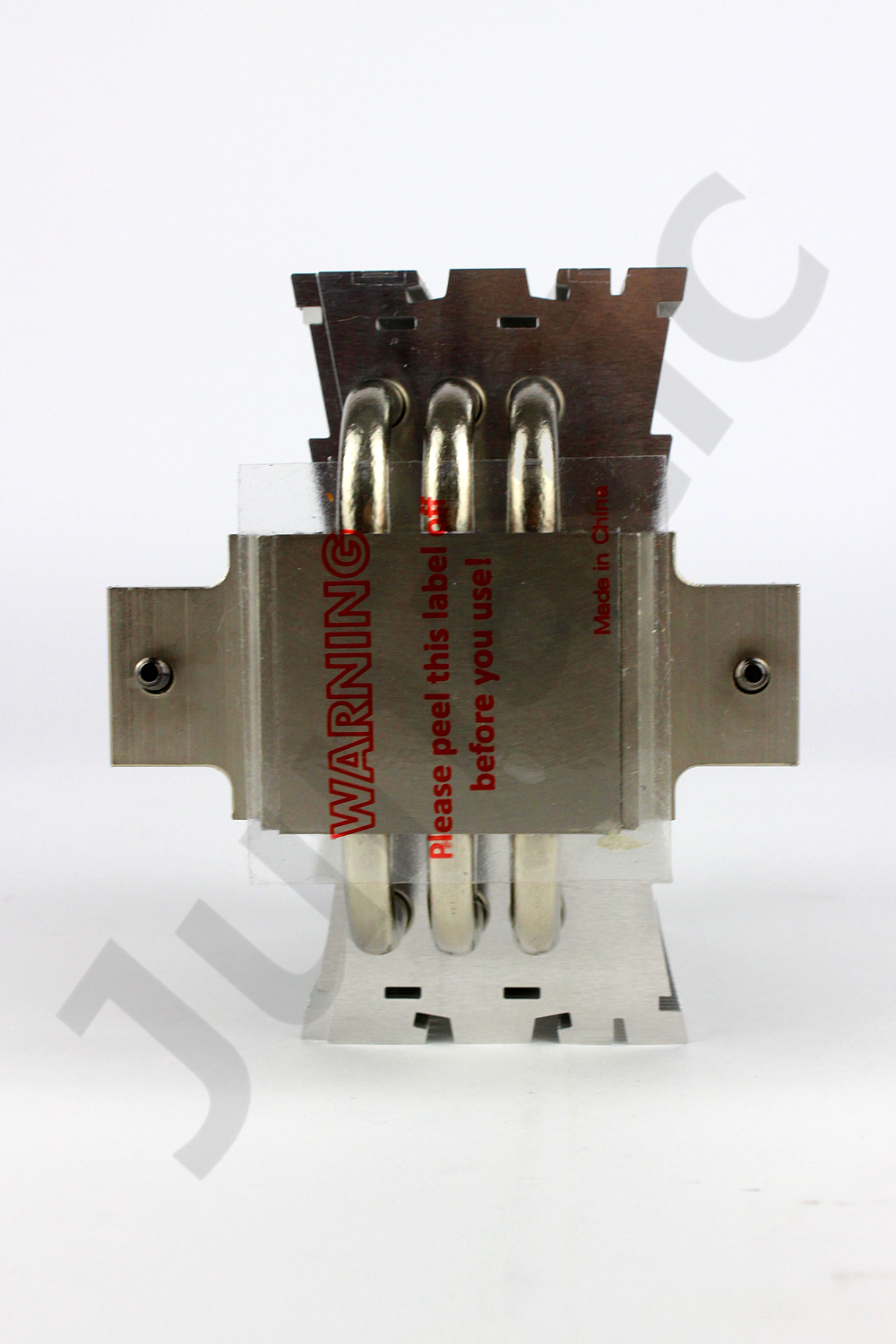 Abschließend werfen wir einen Blick auf die Unterseite des Kühlers. Hier sehen wir die vernickelte Bodenplatte, die mit einem Aufkleber geschützt ist. Die drei Heatpipes sind von hier noch einmal sehr gut zu erkennen. Die Bodenplatte selber ist zwar poliert, jedoch sind noch kleinere Rillen vom Schleifen zu erkennen, sodass kein Spiegelfinish erreicht wird.