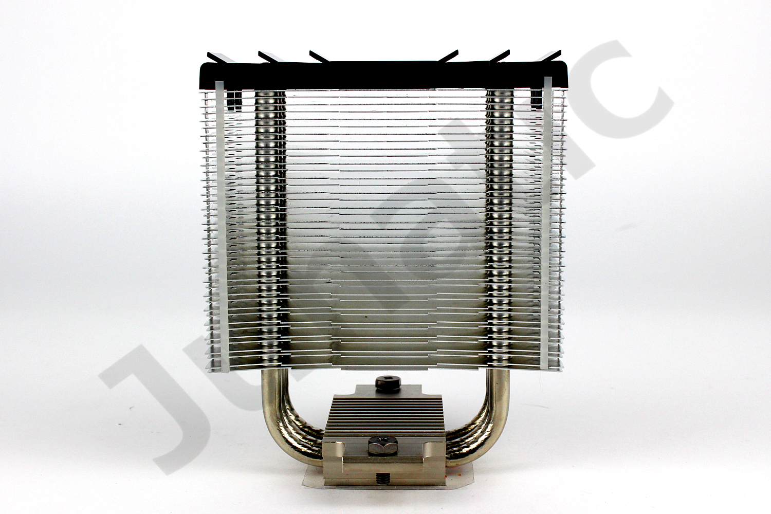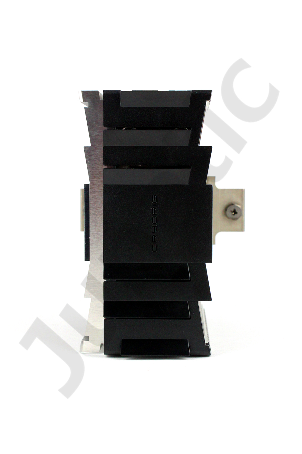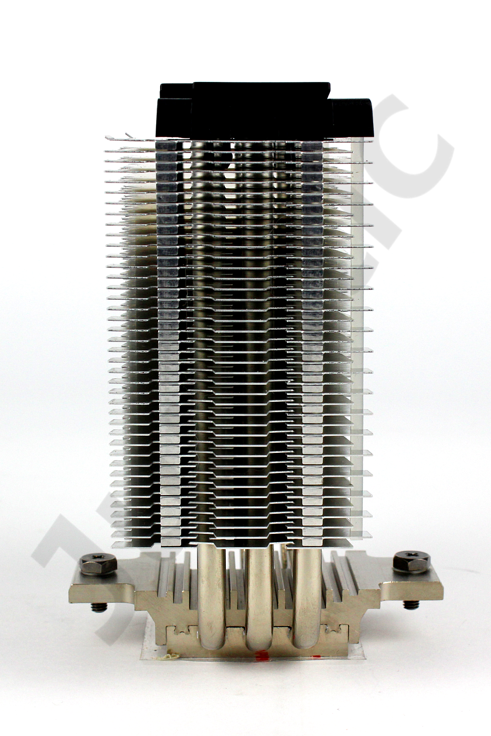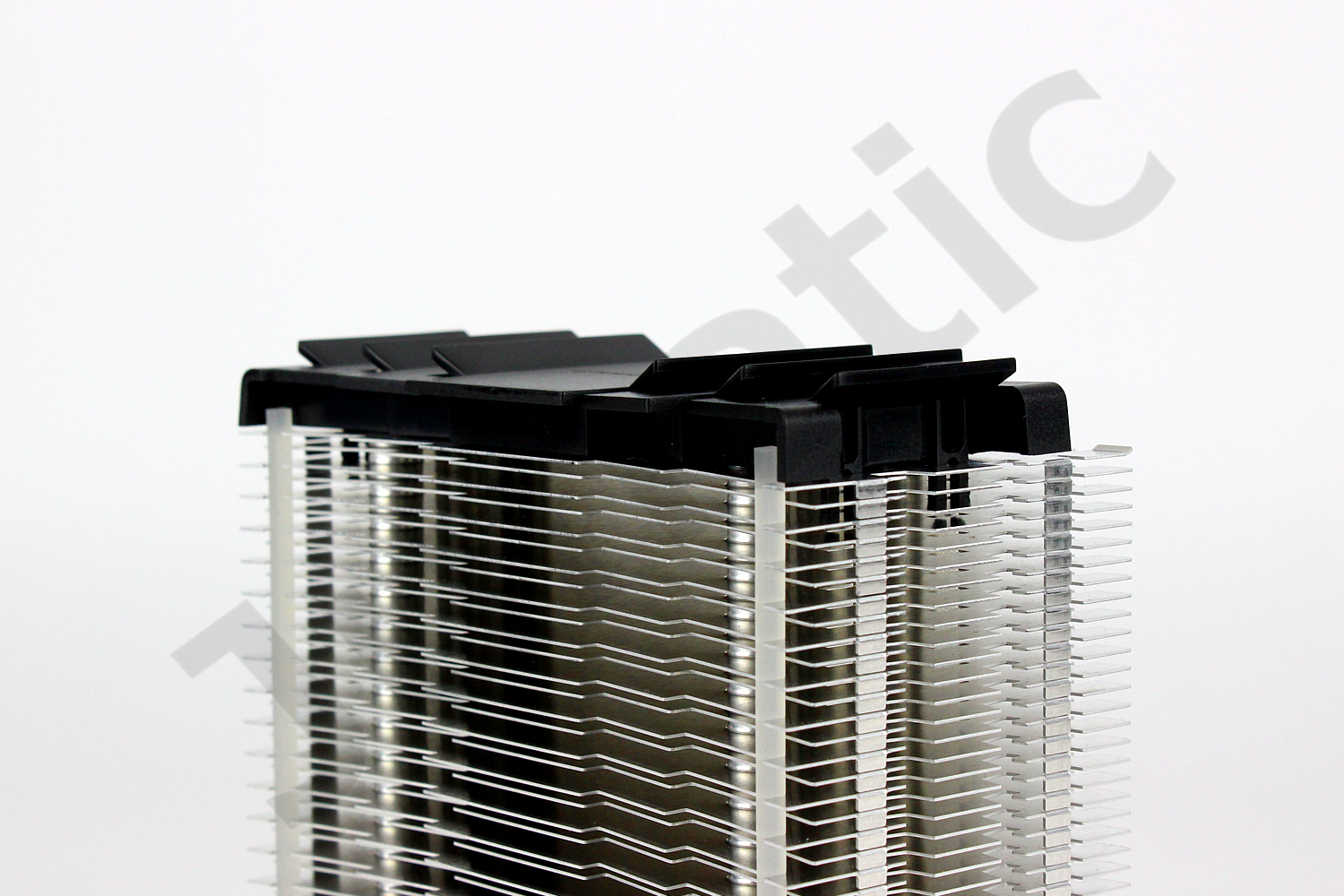 In der Seitenansicht, wird der symmetrische Aufbau deutlich. Ein asymmetrischer Aufbau ist aufgrund der geringen Größe, nicht notwendig. Die enger werdende Finnen Struktur ist von der Seite ebenfalls sehr gut sichtbar. Cryorig verspricht sich von der daraus resultierenden, höheren Luft Geschwindigkeit, eine besser Kühlung und Effizienz.
