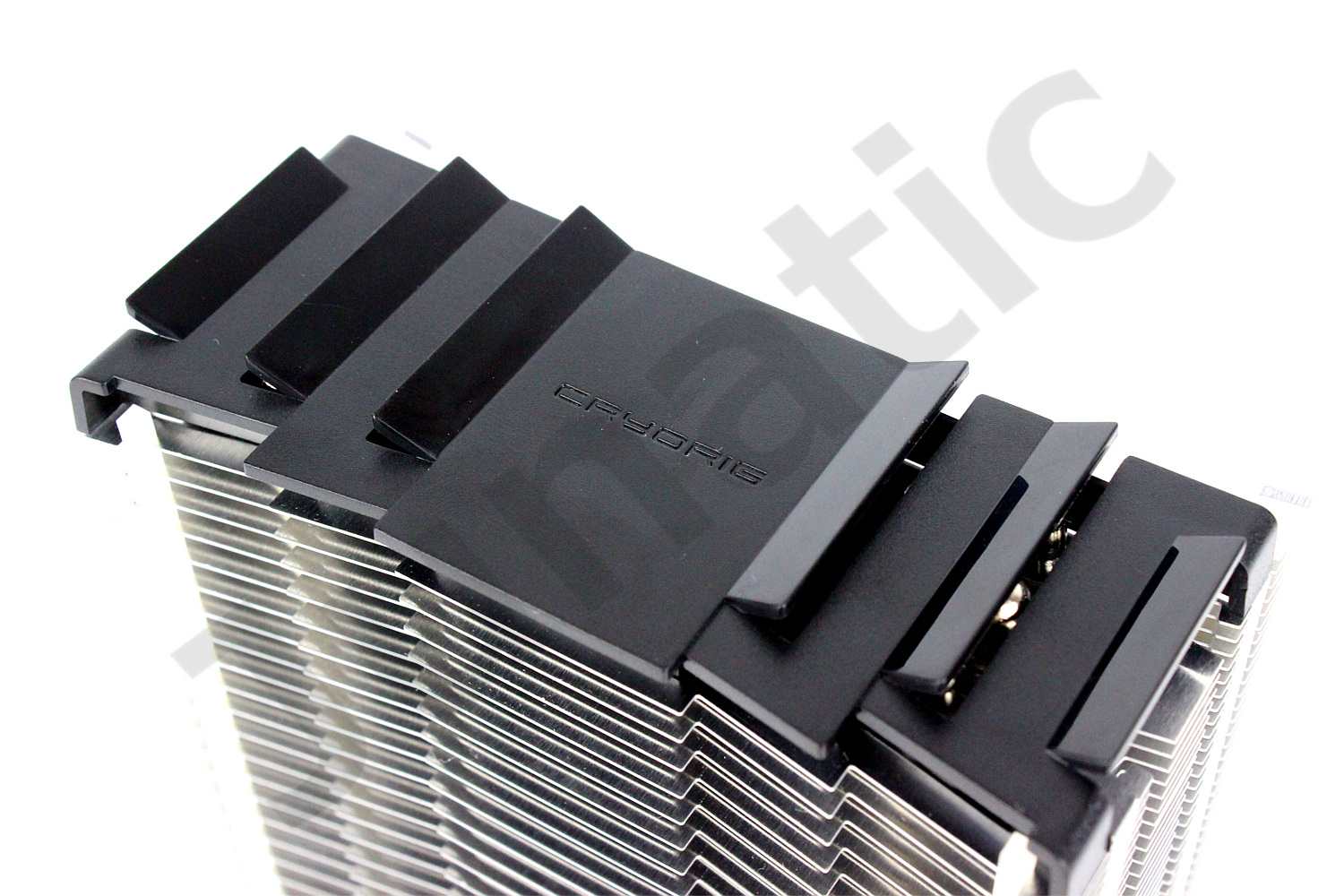 Der Blick auf die Oberseite zeigt die Plastikabdeckung, welche bereits von der Front und der Seite sichtbar war. Diese ist wie beim H7 Kühler, mit dem Cryorig Schriftzug und einer Lamellen artiger Struktur versehen. Einen Einfluss auf die Kühlung hat dies nicht, sondern dient rein der Optik. Ob man lieber die Heatpipe Enden sieht oder nicht, ist zwar Geschmackssache, mir gefallen die Abdeckungen von Cryorig jedoch gut.