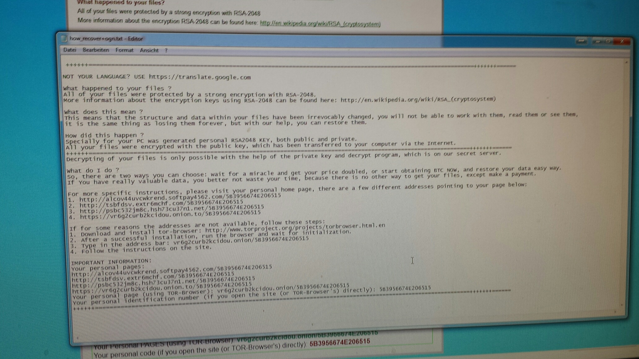 Schattenkopien, Wiederherstellungspunkt und gelöschte Dateien habe ich alles schon überprüft! Da haben die Programmierer der Ransomware ordentliche Arbeit geleistet. Im Internet steht das die mit der Masche schon mehrere Millionen gemacht haben. Da es ein Erpressungsversuch ist, haben wir bei der Polizei angerufen. Mehr aus Neugierde und damit die Polizei das in ihre Statistik aufnehmen kann. Uns wurde allerdings gesagt das die dafür nicht zuständig seien und für die Statistiken bringt dies nichts...