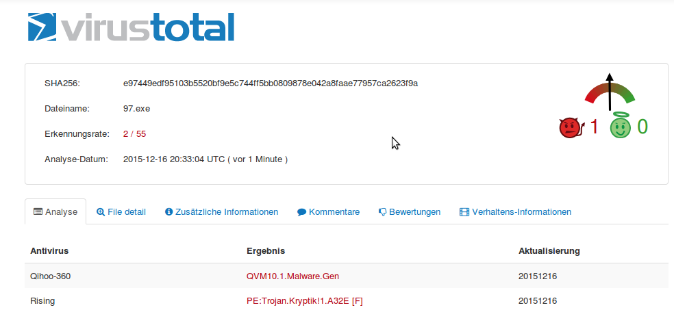 in Bekannter hat gestern eine E-Mail mit einem .zip Anhang bekommen. Da die E-Mail auch an Freunde von ihm gesendet wurde und es um ein Klassentreffen ging, hat er den Anhang dann geöffnet. Vorerst ist nichts passiert. Bedenklich: Die E-Mail ist weder im Spam Ordner gelandet (Microsoft E-Mail Konto) noch hat das Virenprogramm reagiert (Avira AntiVir PRO).