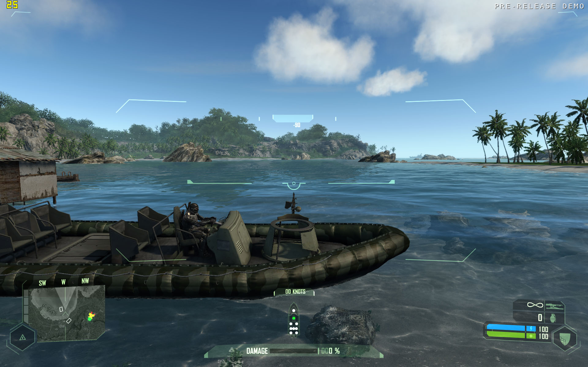 Hier sieht man nochmal den Unterschied beim Wasser: Das "D3D10 Wasser" sieht noch realistischer aus, höherer Wellengang, teils Regenbogen farbige Spiegelungen im Wasser als wenn das Licht der Sonne wie durch ein Prisma in seine Komponenten gesplittet wird (sieht man auf dem Screenshot nicht sofort, man achte auf den großen Stein unter Wasser am Bug des Boots). Natürlich ist der Screenshot mit der niedrigeren fps-Rate D3D10