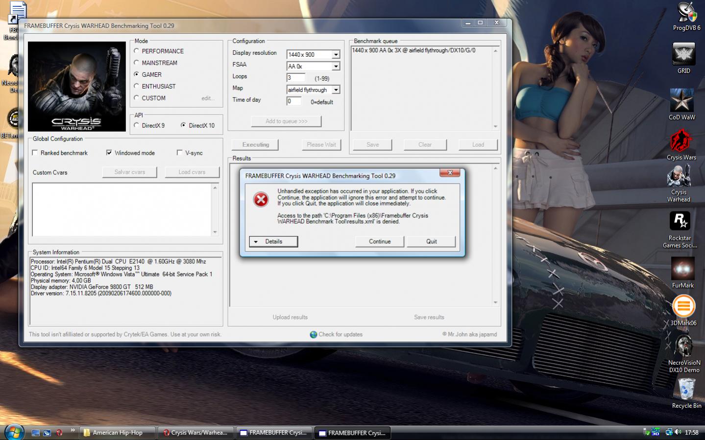 System.UnauthorizedAccessException: Access to the path 'C:\Program Files (x86)\Framebuffer Crysis WARHEAD Benchmark Tool\results.xml' is denied.