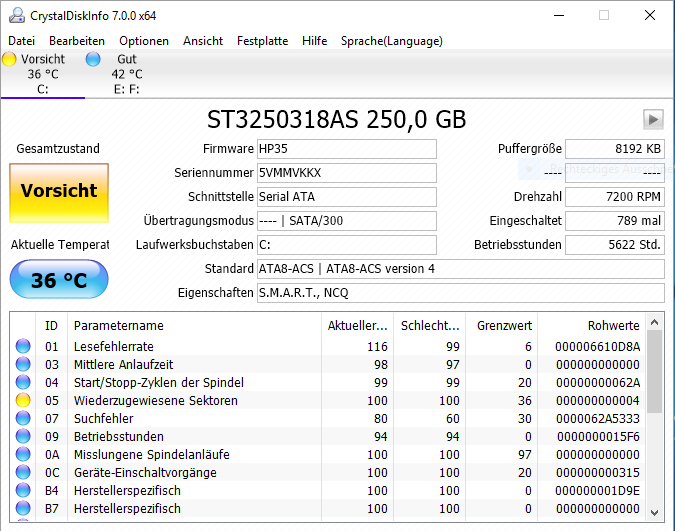 Problematisch ist es vor allem, wenn die Zahl der wiederzugewiesenen (und der schwebenden) Sektoren in kurzer Zeit massiv steigt, da dann meist ein mechanischer Schaden vorliegt und diese eben sehr oft sehr bald zu einem Totalausfall führen, aber sicher kann man auch diese nie zu 100% sagen, das Ansteigen der wiederzugewiesenen Sektoren kann dann auch plötzlich aufhören und die Platte noch lange leben. Das zwar sehr selten, aber auch nicht auszuschließen, 100%ig Aussagen sind daher aufgrund der Werte nicht machbar.