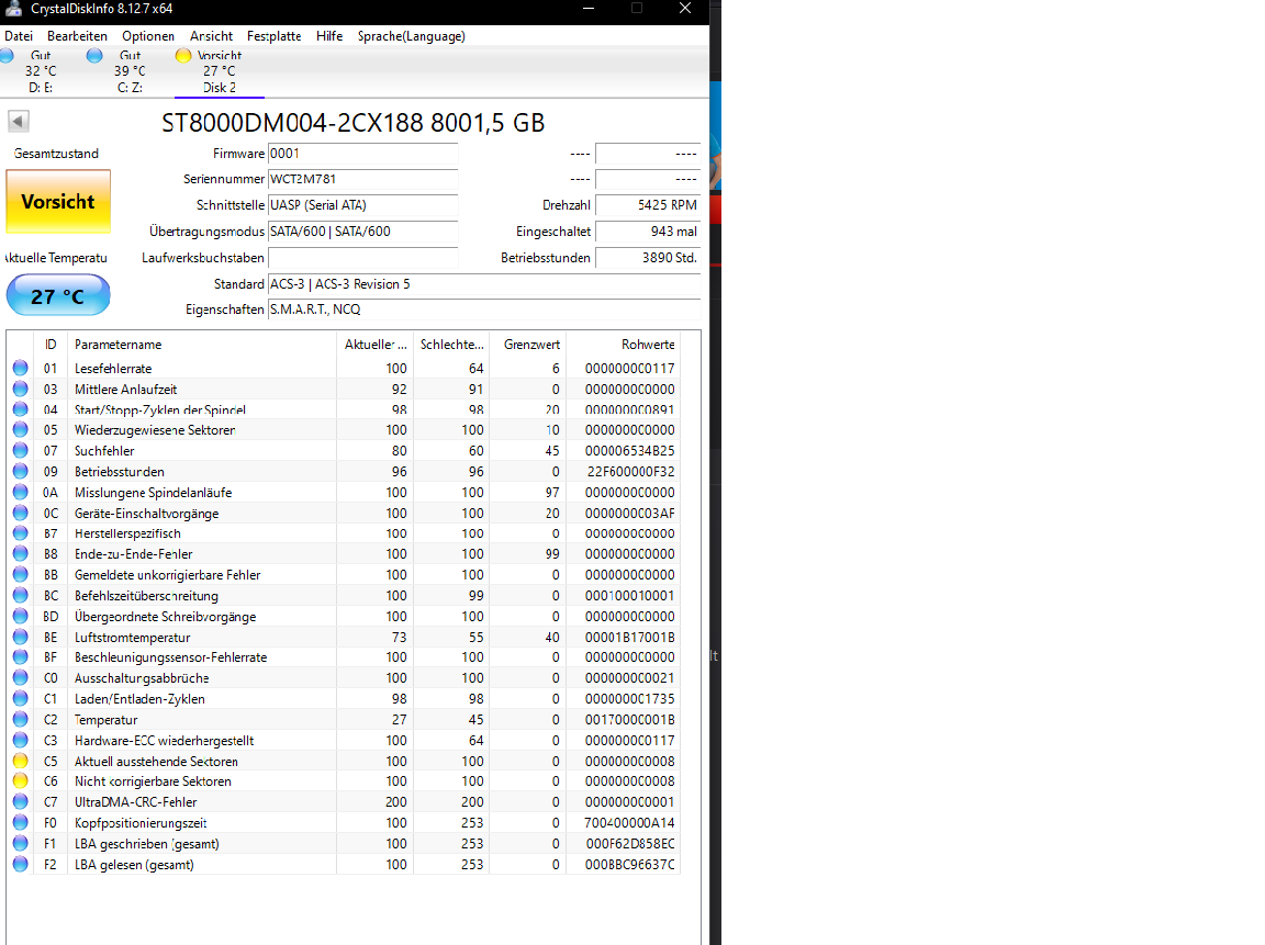 Ich habe eine Segate platte .. diese habe ich mal angeschlossen und geschaut welche Werte sie hat ob alles gut ist.