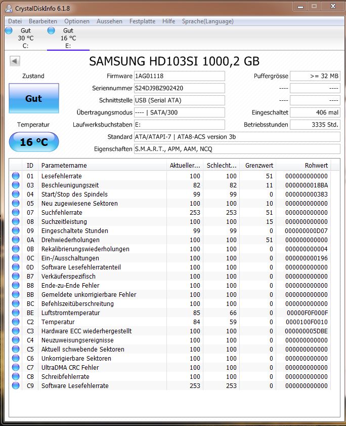 Habe eine Externe Festplatte und zwar eine CnMemory Core, verbaut ist eine Samsung Hd103SI 1TB. Habe letztens den Hinweis in der Ereignisanzeige auf einen Controllerfehler gefunden. Habe jetzt auch keine neuere Firmware gefunden, es ist gerade die 1AG0 drauf. Könnt ihr bitte mal die CrystalDisk-Ausgabe beurteilen.