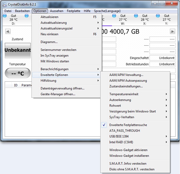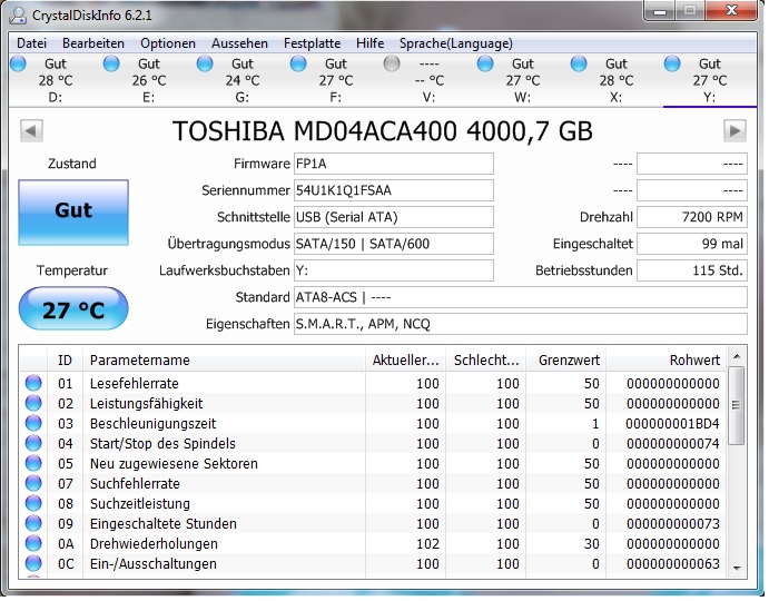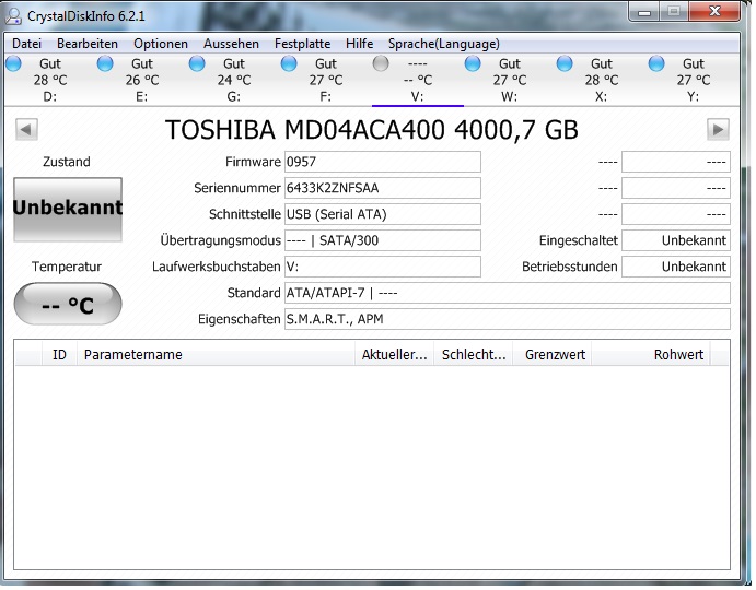 Ich besitze eine LianLi EX-503 mit 5 4TB-Festplatten von Toshiba. Aus irgendeinem mir nicht erschließbaren Grund wird die erste Festplatte (V) im Raid (Clean-Modus - alle Festplatten werden einzeln angezeigt) nicht von CrystalDiskInfo erkannt (es wird nur der Name angezeigt, aber keine genaueren Informationen - siehe Screenshot). Der Fehler tritt auch auf, wenn die Festplatte im 2. oder 3. Slot steckt. Alle anderen werden normal angezeigt (W-Z) und im Arbeitsplatz kann ich alle Festplatten normal sehen und auch nutzen. Ein Festplatten-Check mit HD Tune brachte keine Fehler und dort wird die Festplatte normal wie die anderen angezeigt. Muss ich mir da sorgen um die Daten machen oder liegt es vielleicht allgemein an dem Raid oder CrystalDiskInfo selbst?