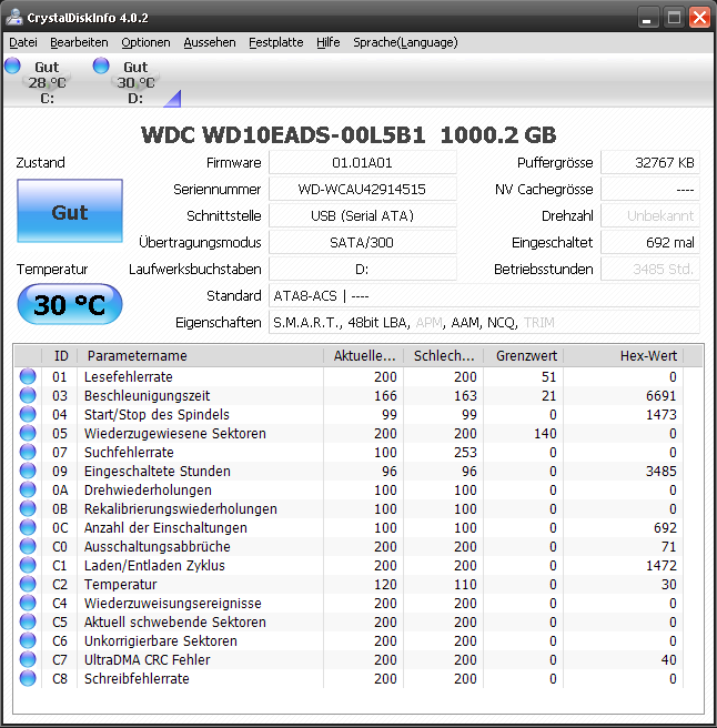 Die Smart-Werte sehen ansonsten noch gut aus. Also es gibt keinen Hinweis auf ein Laufwerksdefekt oder -problem.