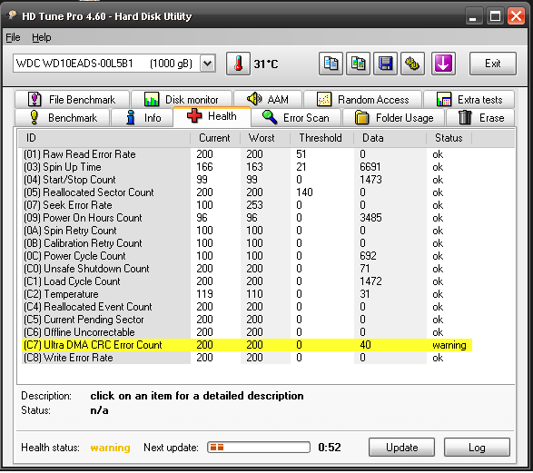 Die Warnung zeigt, dass Fehler bei der Datenübertragung vorgekommen sind, weshalb die Daten erneut übertragen werden mussten. Das liegt in der Regel an einem defekten oder nicht richtig sitzenden Datenkabel. Allerdings können diese Übertragungsfehler auch schon lange zurückliegen, da das ein Zähler ist, der nicht zurückgesetzt wird. Wichtig ist, dass der Data-Wert dieses Attributes nicht weiter ansteigt. Das musst du von Zeit zu Zeit kontrollieren.