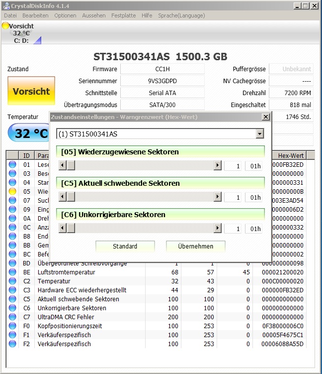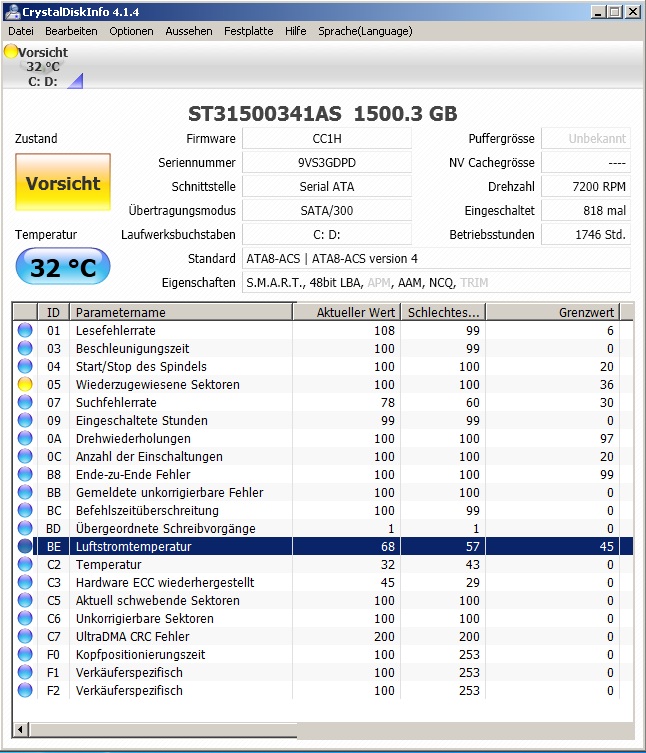 Aber mich interressiert warum CrystalDiskInfo mir den Zustand vorsicht an?