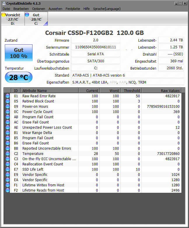 Zum Problem: Das Label hat nicht genug Platz, es soll die gesamten Datenmengen anzeigen, die über das SATA Interface gelesen bzw. geschrieben wurden. Zu finden auch unter F1 und F2 in der Liste der Werte. E9 ist übrigens die Datenmenge die nach der Datenkompression noch wirklich ins Flash geschrieben wurde. Bei wurden die Daten im Schnitt auf 77% also um 23% komprimiert, nicht wirklich viel.