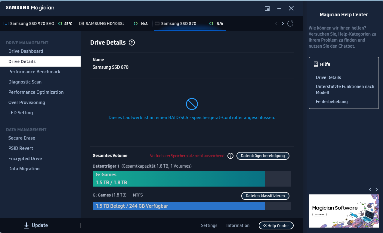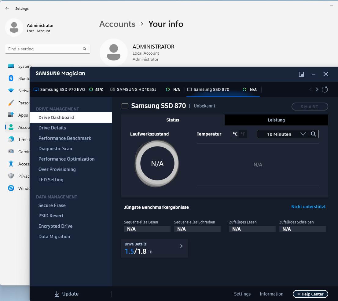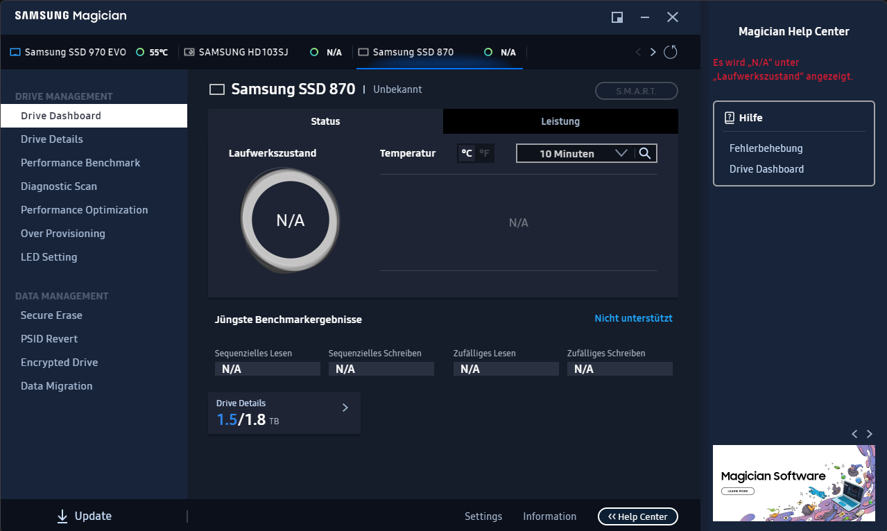 Also meine Frage wäre jetzt: Hat jemand eine Idee, was ich tun kann, damit ich meine SSD 870 EVOs Details sehen kann, entweder in CrystalDiskInfo oder Samsung Magician? Ich wollte eigentlich nur wissen, ob sie noch gut ist oder broken.