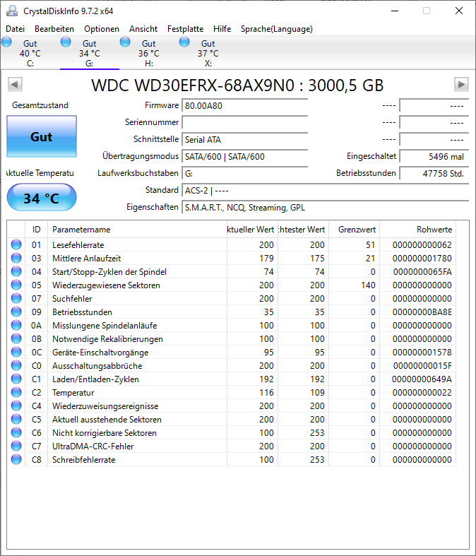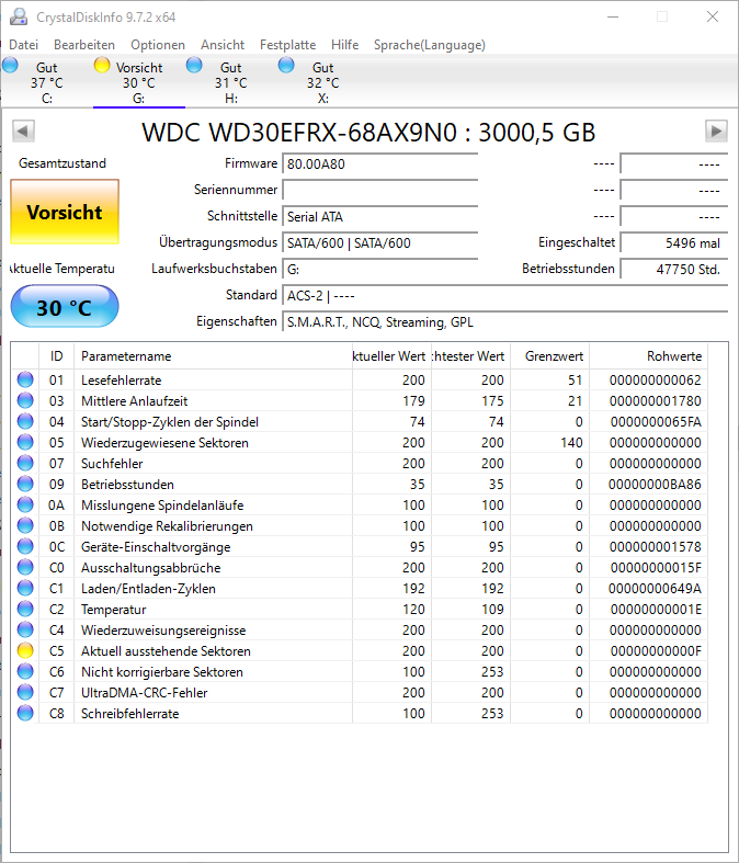 Die Festplatte ist, wie gesagt, bereits alt. Sie wurde 5.496 Mal eingeschaltet, die Betriebsstunden belaufen sich auf 47.750 Std (auch homeofficebedingt).
