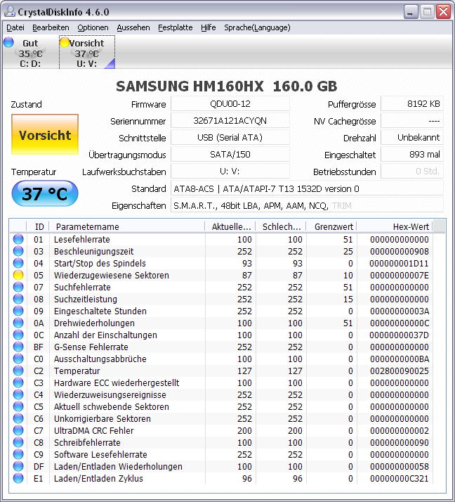 Dort wird der Zustand der Platte mit "Vorsicht" angezeigt.