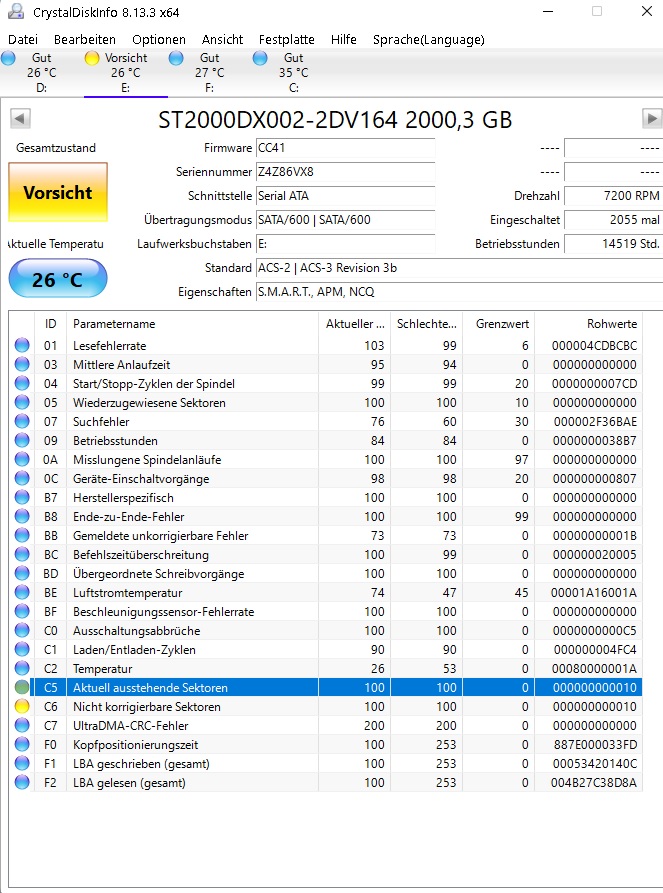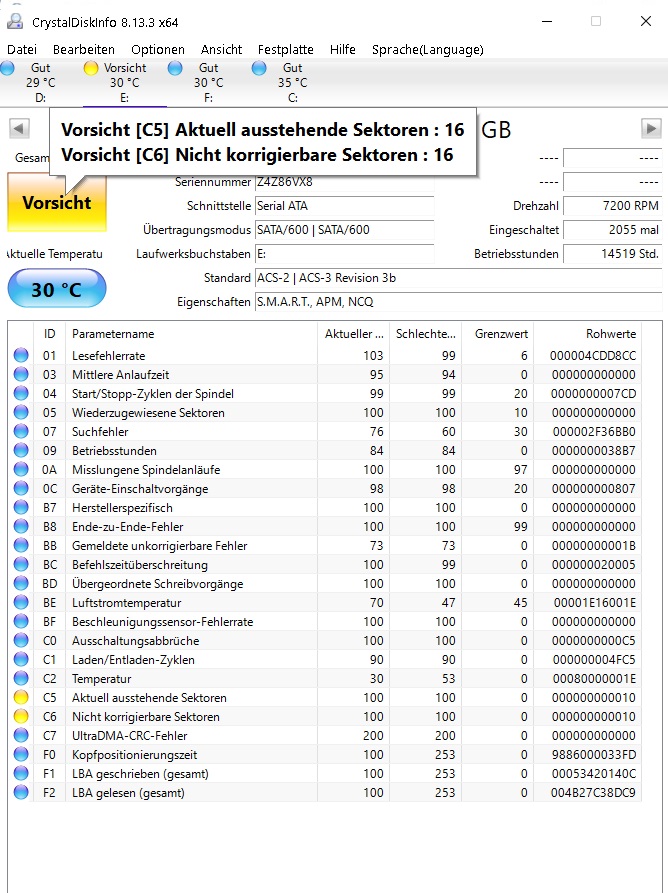 Naja, steht da ja. Du hast 16 nicht korrigierbare Sektoren. Warum die jetzt genau kaputt sind....who knows. Ist aber auch egal. Die Platte ist nicht mehr vertrauenswürdig. 14000 Stunden Betrieb ist ja jetzt auch nicht sooo wenig