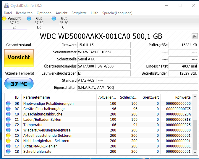 Ich habe mir mal wieder CrystalDiskInfo runtergeladen und gesehen das meine Festplatte(E den Zustand "Vorsichtig" anzeigt bei C5 und C6. Muss ich mir sorgen machen?
