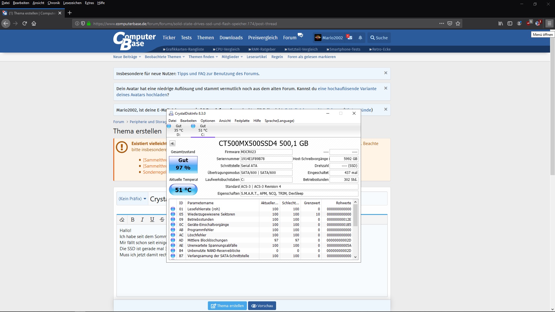 Die SSD ist gerade mal 302 Stunden gelaufen.