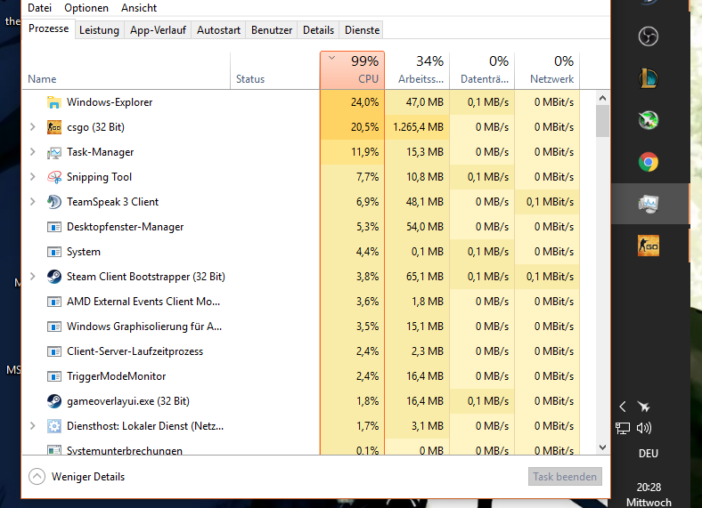 Hey Leute ich hab seid einigen Tagen das Problem das Cs:GO 100% der CPU Leistung verbraucht. Verbaut ist ein Ryzen 1700 mit 4ghz läuft stabil unter last bei Max 50° wassergekühlt natürlich . Dazu 16gb ram mit 3200mhz r9 390 Gaming 8gb auf dem Msi Gaming plus x370.